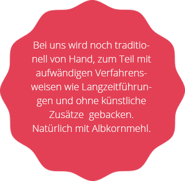 Bei uns wird noch traditionell von Hand, zum Teil mit aufwändigen Verfahrensweisen wie Langzeitführungen und ohne künstliche Zusätze gebacken. Natürlich mit Albkornmehl.